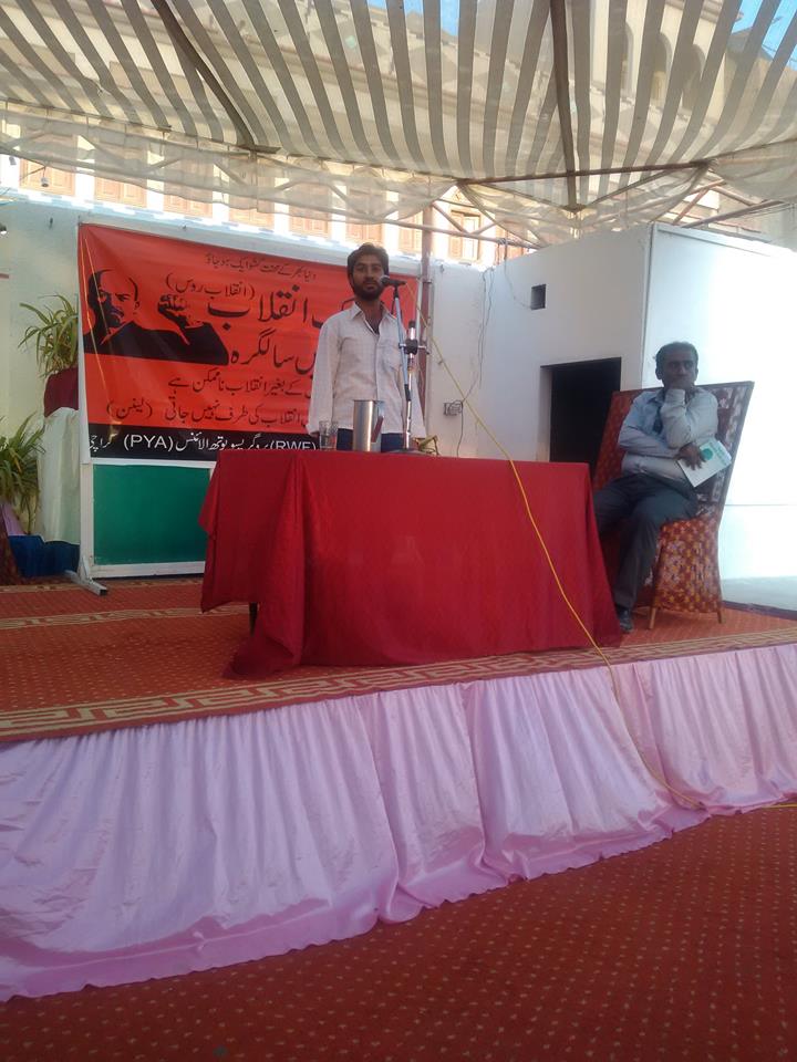 تصور قیصرانی اور صفدر جبار نے اپنے خطاب میں کہا کہ بالشویک انقلاب طبقاتی سماج کو ختم کرنے کی اب تک کی سب سے سنجیدہ کوشش ہے۔ ان کا کہنا تھا کہ دنیا آج جس بحران سے دوچار ہے اس سے نکلنے کا واحد راستہ پھر ایک سوشلسٹ انقلاب ہی ہے۔ انہوں نے اس عزم کا اظہار کیا کہ وہ پاکستان کے محنت کشوں کو ایک پلیٹ فارم پر یکجا کر کے حکمران طبقے کے ہر ظلم کا ڈٹ کر جواب دیں گے۔ فارس کا کہنا تھا کہ آج سیاست کو نوجوانوں کے لیے شجر ممنوعہ بنا دیا گیا ہے جس کا مقصد یہ ہے کہ بلاول بھٹو اور مریم نواز ایسے موروثی کردار حکمرانی کرتے رہیں اور محنت کش طبقے سے تعلق رکھنے والے نوجوان اپنے حقوق سے آ گاہی حاصل نہ کر سکیں، ان کا کہنا تھا کہ آج حکمران طبقات نوجوانوں کو انسانیت سے محبت کا درس دے رہے ہیں جس کا مقصد پھر محنت کش طبقے کے نوجوانوں کے شعور کو مسخ کرنا ہے ۔ سرمایہ داروں نے اس دنیا کو ایک جہنم میں بدل دیا ہے اس لیے سرمایہ دار طبقے سے صرف نفرت کی جا سکتی ہے کیوں کہ وہ ظالم اور جابر کردار کا حامل ہے۔ فارس کی تقریر کے بعد پی وائی اے ملیر کے نوجوان کارکن جلال جان نے انقلابی نظم پیش کی جس کو سامعین نے بے حد پسند کیا۔
