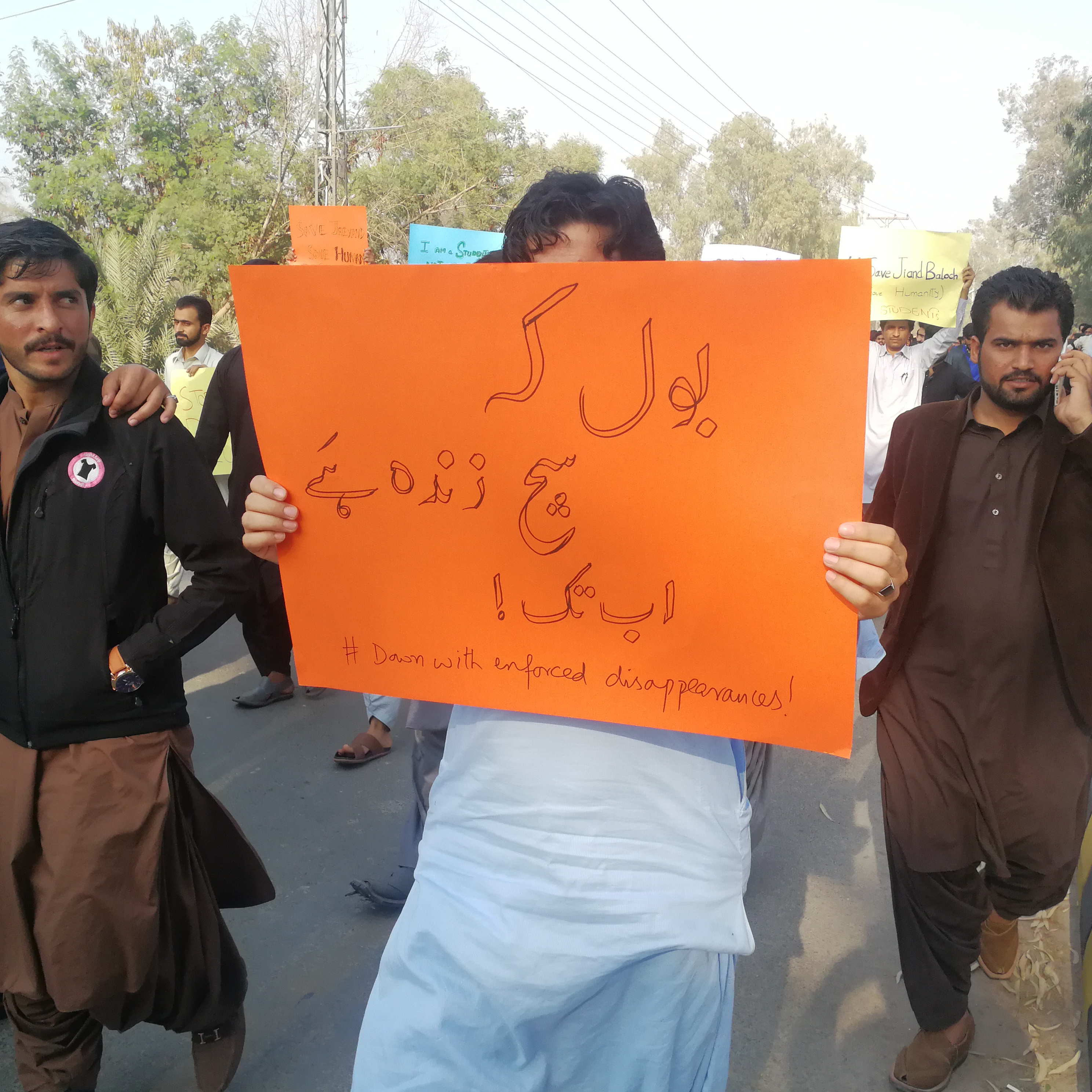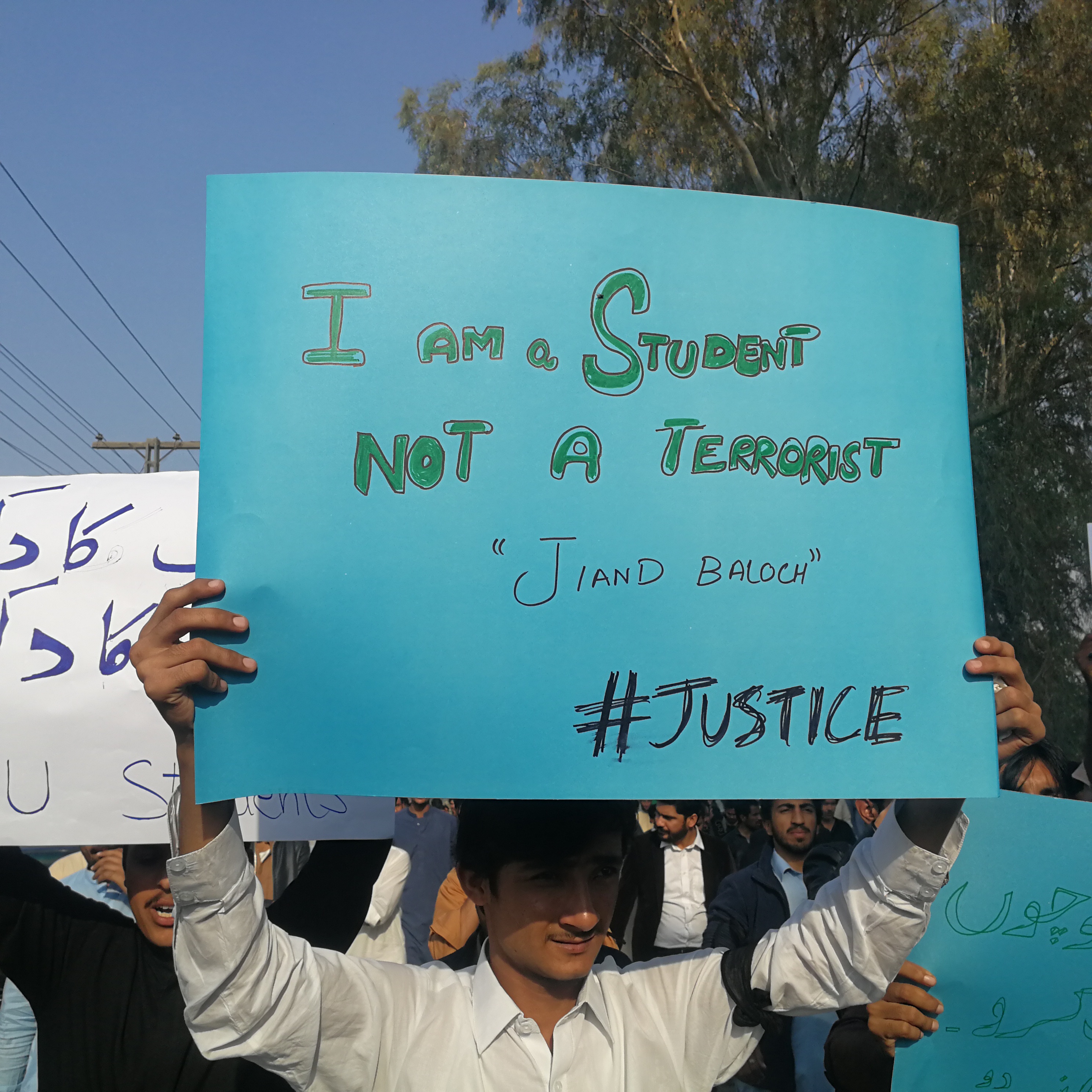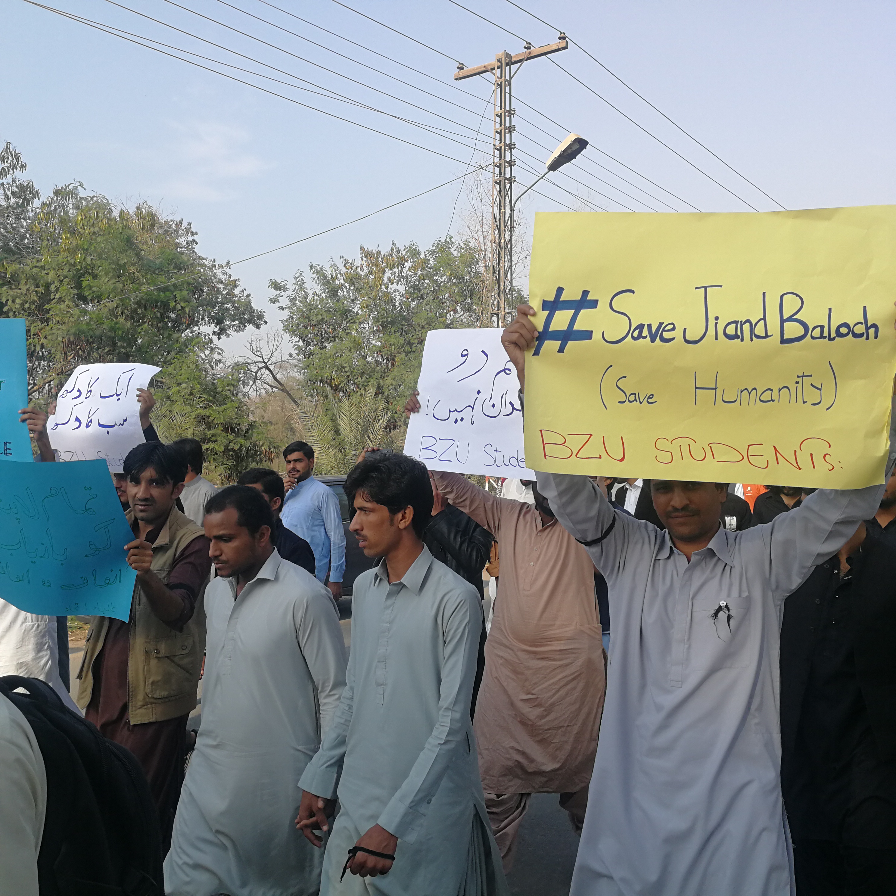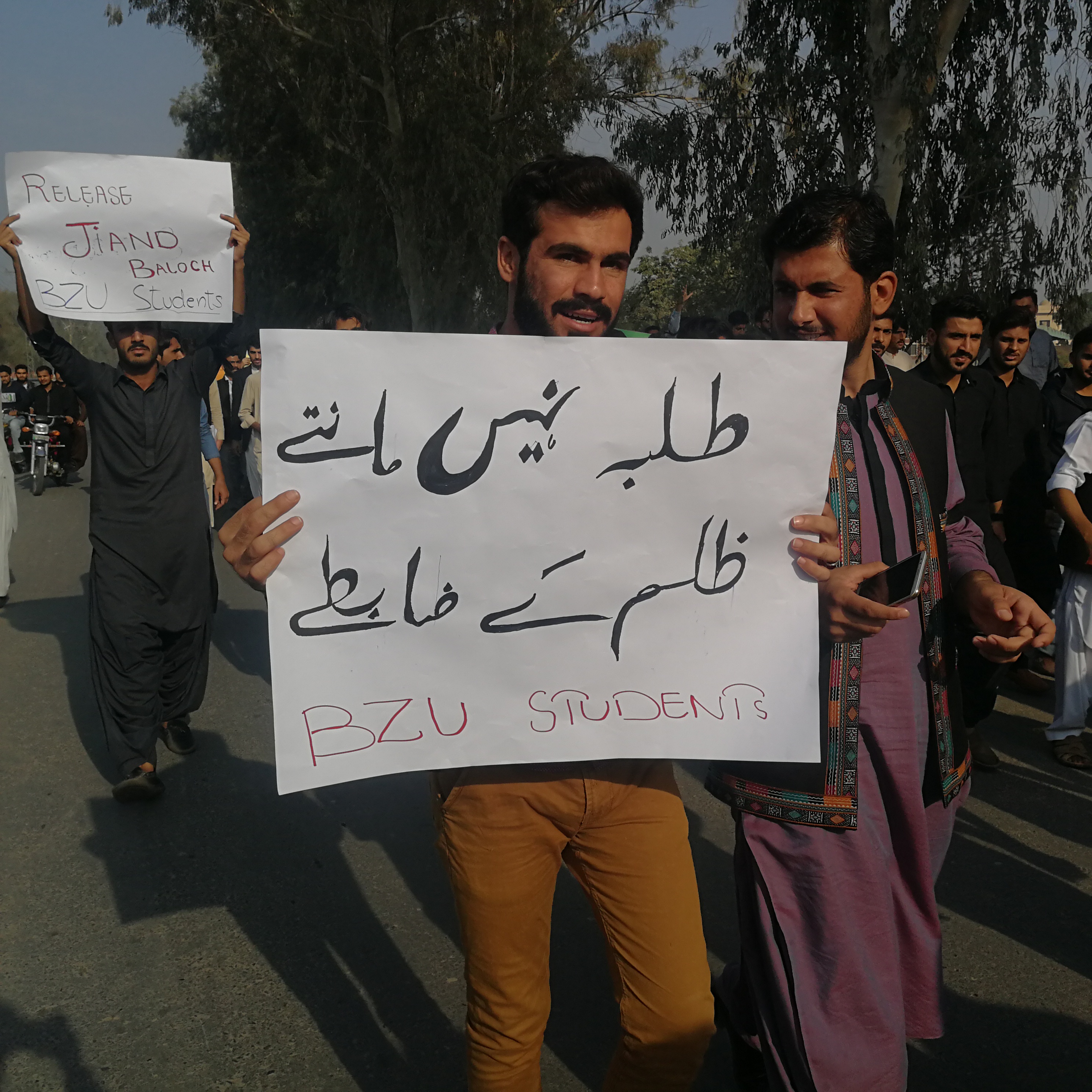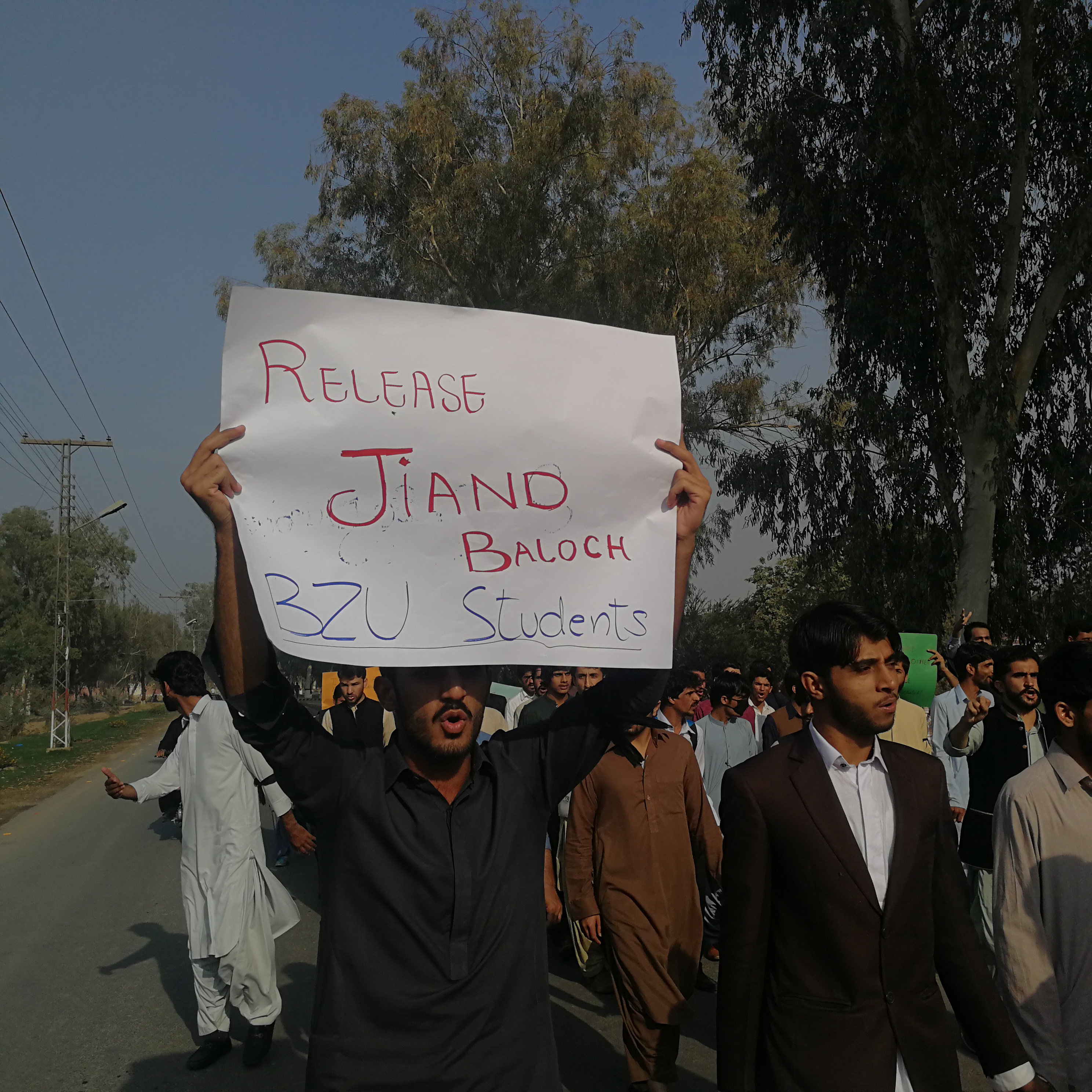 جیند بلوچ، جو بہاؤالدین زکریا یونیورسٹی ملتان میں شعبہ سوشیالوجی کا طالب علم ہے، کو کوئٹہ میں چھوٹے بھائی اور والد سمیت گھر سے سکیورٹی فورسز کی جانب سے 30نومبر2018ء بروز جمعہ رات 3بجے کے قریب جبری طور پر اغوا کیا گیا۔ اس جبری گمشدگی کے خلاف 3دسمبر2018ء کو بی زیڈ یو میں مختلف شعبہ جات سے تعلق رکھنے والے طلبہ نے یونیورسٹی کے اندر ایک احتجاجی ریلی نکالی اور اسکے بعد پریس کلب ملتان کے سامنے بھی احتجاج کیا۔ اسکے علاوہ جیند کی کلاس میں بھی اسکے ہم جماعتوں کی جانب سے اسکے حق میں مختصر احتجاج کیا گیا۔